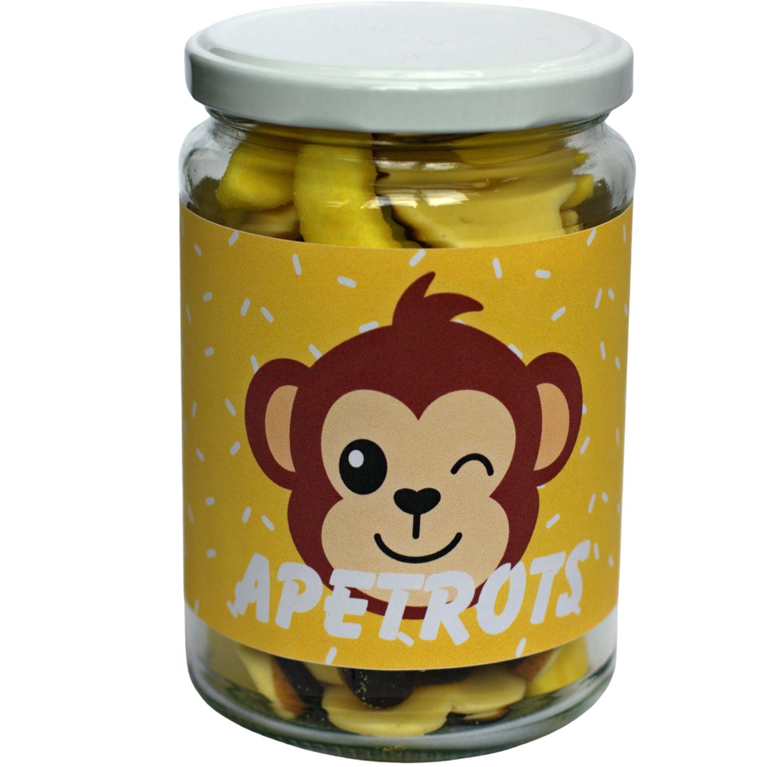Êtes-vous incroyablement fier de quelqu'un ? Montrez-le avec cette joyeuse bonbonnière en verre , remplie de 300 grammes de bonbons variés . L'étiquette jaune, ornée d'un singe espiègle et du texte « Apetrots » (Fier), en fait un cadeau idéal pour féliciter quelqu'un pour une réussite ou simplement exprimer votre fierté.