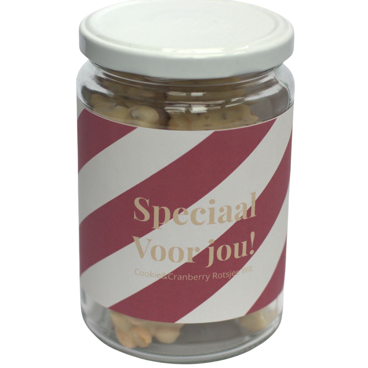Ce bocal en verre contient 225 grammes de délicieux biscuits au chocolat blanc et aux canneberges – une alliance parfaite de chocolat blanc crémeux, de morceaux de biscuits croquants et de canneberges fruitées. Son élégante étiquette, ornée de l'inscription « Spécialement pour vous », en fait le cadeau idéal pour surprendre, remercier ou simplement offrir une douceur.