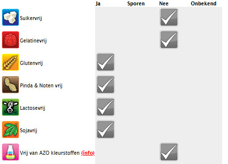 Ingrédients : Sirop de glucose, sucre, eau, gélatine de bœuf halal, amidon de pomme de terre modifié, acidulant : E330, E270 ; arôme artificiel, colorants : E163, E129, E100, E160a, E133.